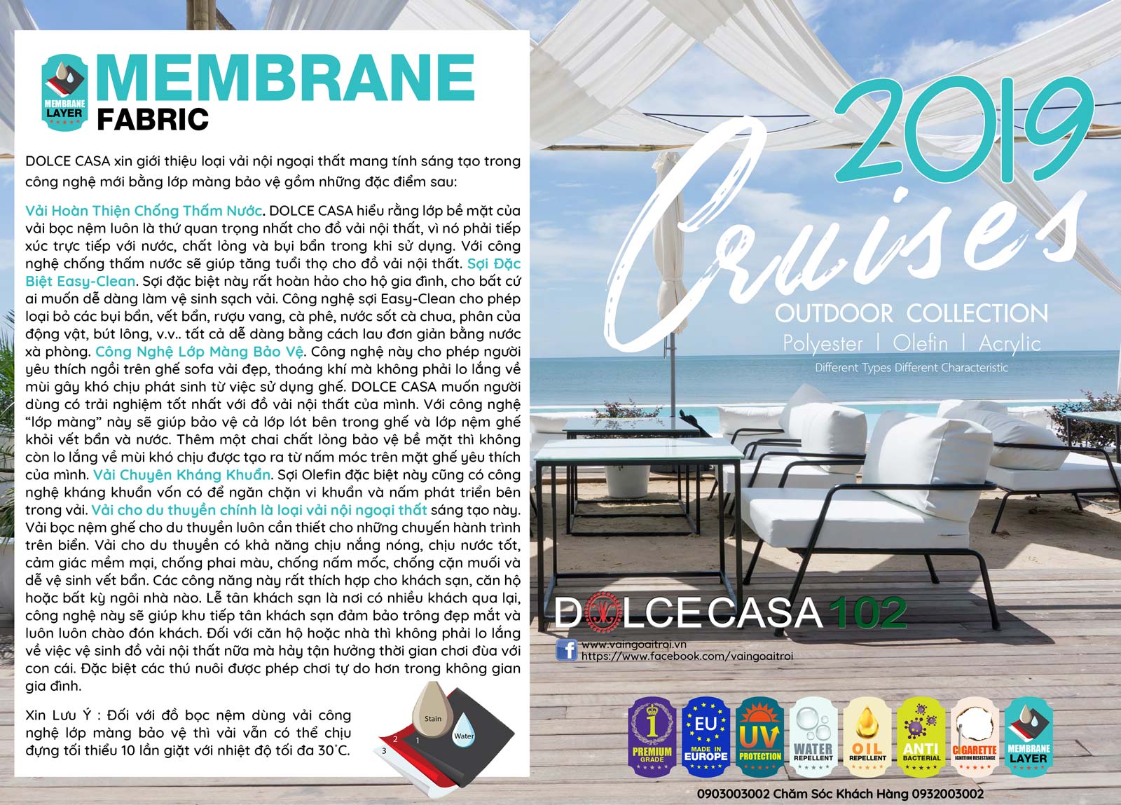 CRUISES MEMBRANE FABRIC là loại vải chuyên dụng cho không gian sống ở ngoài trời trên du thuyền. Vải mang tính sáng tạo trong công nghệ mới bằng lớp màng bảo vệ gồm 4 đặc điểm sau: